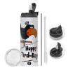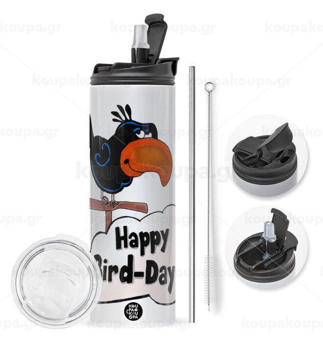 Happy Bird Day, Travel Tumbler θερμό με διπλό καπάκι, μεταλλικό καλαμάκι και βούρτσα καθαρισμού (Ανωξείδωτο 304 Food grade, BPA free, 600ml)