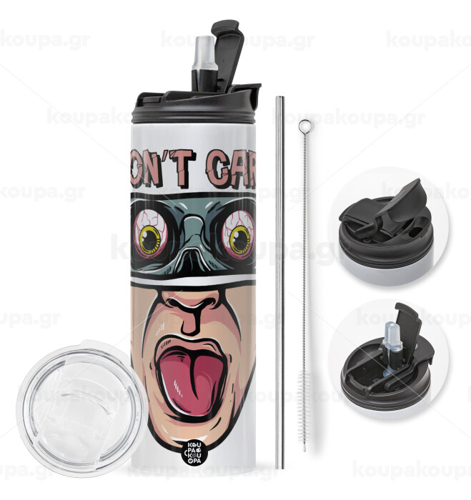 Don't Care, Travel Tumbler θερμό με διπλό καπάκι, μεταλλικό καλαμάκι και βούρτσα καθαρισμού (Ανωξείδωτο 304 Food grade, BPA free, 600ml)