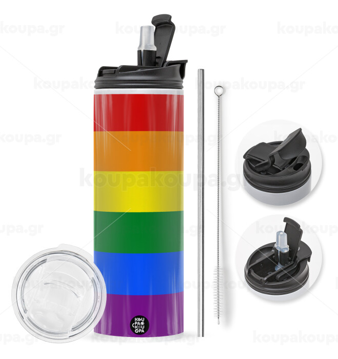 Rainbow flag (LGBT) , Travel Tumbler θερμό με διπλό καπάκι, μεταλλικό καλαμάκι και βούρτσα καθαρισμού (Ανωξείδωτο 304 Food grade, BPA free, 600ml)