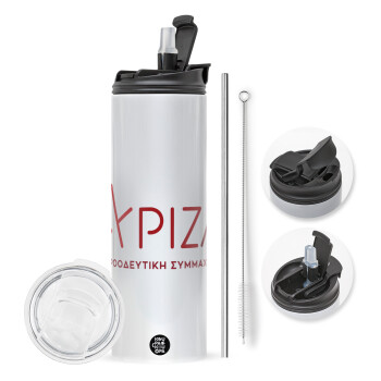 Σύριζα το νέο, Travel Tumbler θερμό με διπλό καπάκι, μεταλλικό καλαμάκι και βούρτσα καθαρισμού (Ανωξείδωτο 304 Food grade, BPA free, 600ml)