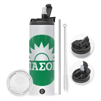 ΠΑΣΟΚ Πράσινο, Travel Tumbler θερμό με διπλό καπάκι, μεταλλικό καλαμάκι και βούρτσα καθαρισμού (Ανωξείδωτο 304 Food grade, BPA free, 600ml)