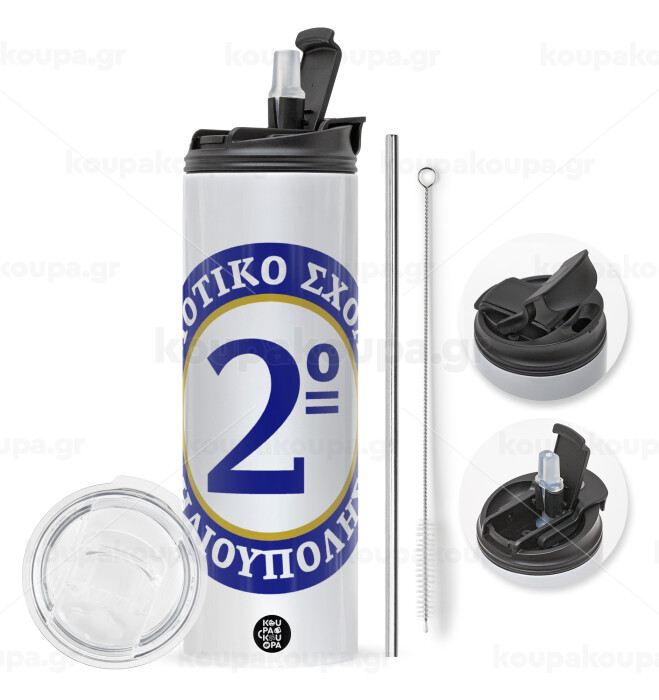 Έμβλημα Σχολικό μπλε/χρυσό, Travel Tumbler θερμό με διπλό καπάκι, μεταλλικό καλαμάκι και βούρτσα καθαρισμού (Ανωξείδωτο 304 Food grade, BPA free, 600ml)