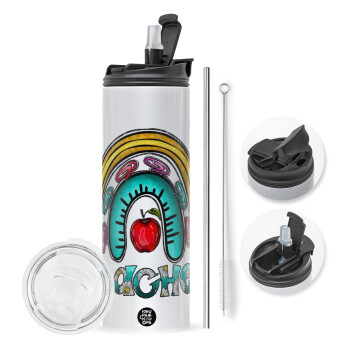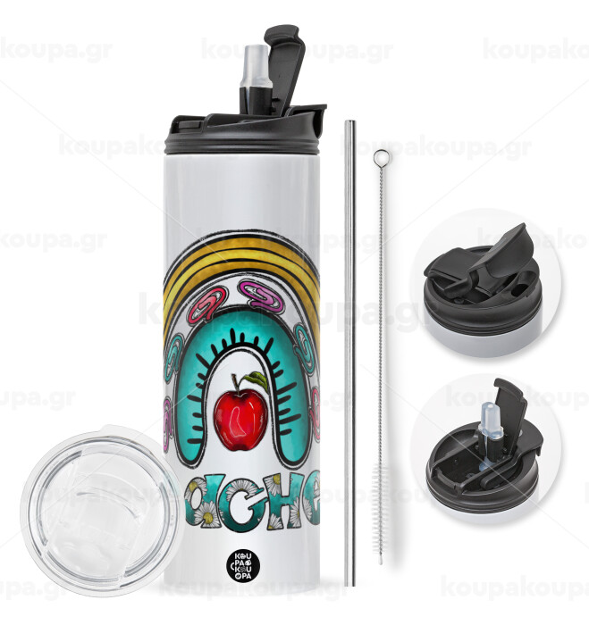 Teacher, Travel Tumbler θερμό με διπλό καπάκι, μεταλλικό καλαμάκι και βούρτσα καθαρισμού (Ανωξείδωτο 304 Food grade, BPA free, 600ml)