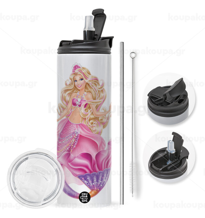 Barbie γοργόνα μπλε, Travel Tumbler θερμό με διπλό καπάκι, μεταλλικό καλαμάκι και βούρτσα καθαρισμού (Ανωξείδωτο 304 Food grade, BPA free, 600ml)