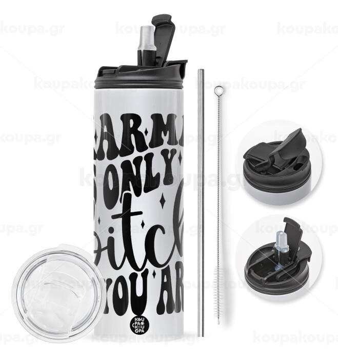 Karma is Only A Bitch if You Are, Travel Tumbler θερμό με διπλό καπάκι, μεταλλικό καλαμάκι και βούρτσα καθαρισμού (Ανωξείδωτο 304 Food grade, BPA free, 600ml)
