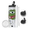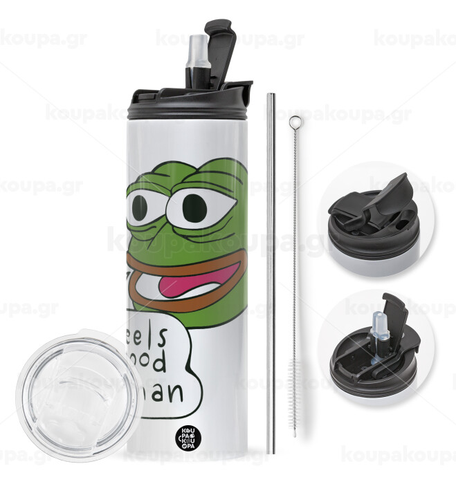 Pepe the frog, Travel Tumbler θερμό με διπλό καπάκι, μεταλλικό καλαμάκι και βούρτσα καθαρισμού (Ανωξείδωτο 304 Food grade, BPA free, 600ml)