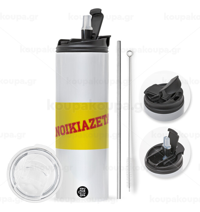 ΕΝΟΙΚΙΑΖΕΤΑΙ, Travel Tumbler θερμό με διπλό καπάκι, μεταλλικό καλαμάκι και βούρτσα καθαρισμού (Ανωξείδωτο 304 Food grade, BPA free, 600ml)