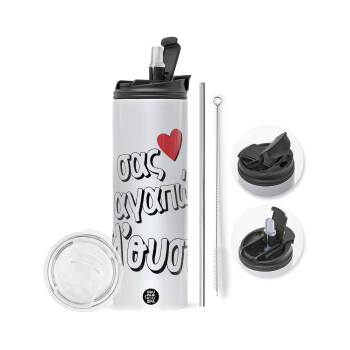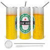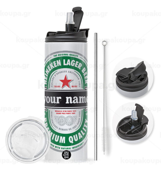 Heineken με όνομα, Travel Tumbler θερμό με διπλό καπάκι, μεταλλικό καλαμάκι και βούρτσα καθαρισμού (Ανωξείδωτο 304 Food grade, BPA free, 600ml)