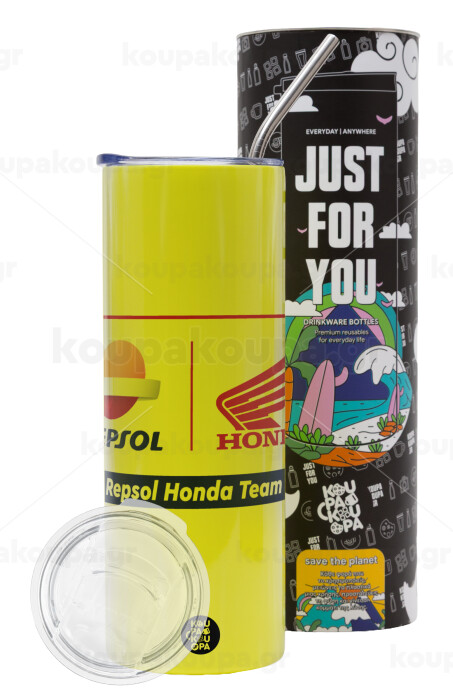 Honda Repsol Team, Neon Yellow Travel Tumbler θερμό, μεταλλικό καλαμάκι(Ανωξείδωτο 304 Food grade, BPA free, 600ml)