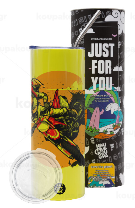 Motocross, Neon Yellow Travel Tumbler θερμό, μεταλλικό καλαμάκι(Ανωξείδωτο 304 Food grade, BPA free, 600ml)