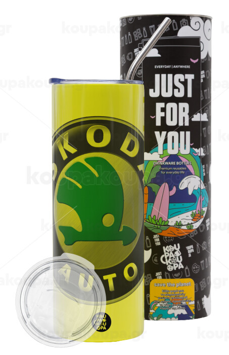 SKODA, Neon Yellow Travel Tumbler θερμό, μεταλλικό καλαμάκι(Ανωξείδωτο 304 Food grade, BPA free, 600ml)