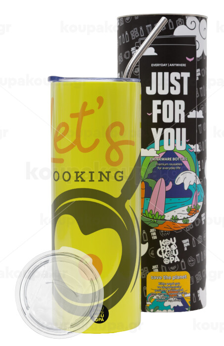 Let's cooking, Neon Yellow Travel Tumbler θερμό, μεταλλικό καλαμάκι(Ανωξείδωτο 304 Food grade, BPA free, 600ml)