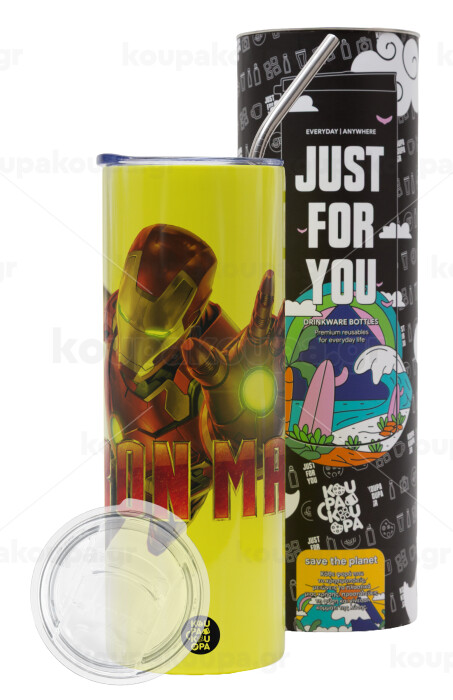 Ironman, Neon Yellow Travel Tumbler θερμό, μεταλλικό καλαμάκι(Ανωξείδωτο 304 Food grade, BPA free, 600ml)
