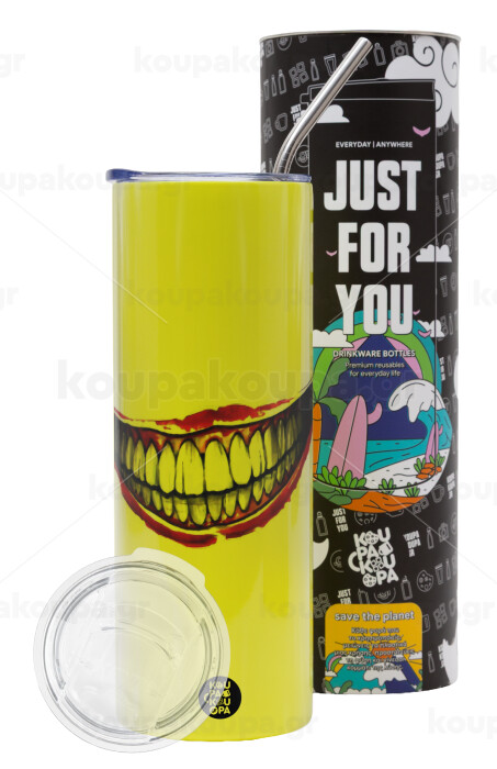 Joker smile, Neon Yellow Travel Tumbler θερμό, μεταλλικό καλαμάκι(Ανωξείδωτο 304 Food grade, BPA free, 600ml)