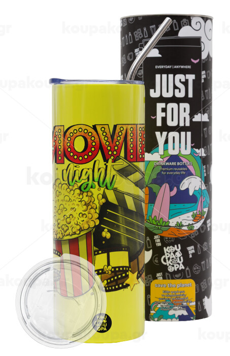 Movie night, Neon Yellow Travel Tumbler θερμό, μεταλλικό καλαμάκι(Ανωξείδωτο 304 Food grade, BPA free, 600ml)