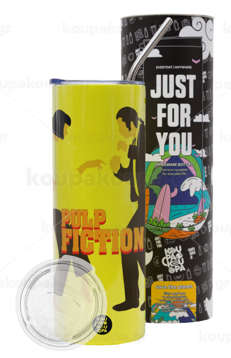 Pulp Fiction dancing, Neon Yellow Travel Tumbler θερμό, μεταλλικό καλαμάκι(Ανωξείδωτο 304 Food grade, BPA free, 600ml)