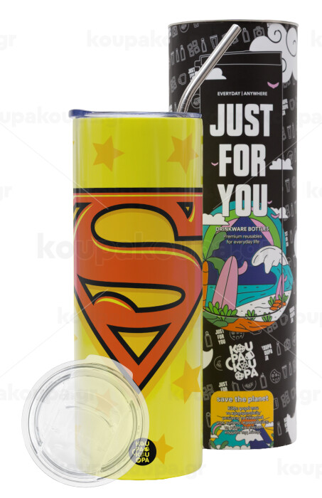 Superman Pink, Neon Yellow Travel Tumbler θερμό, μεταλλικό καλαμάκι(Ανωξείδωτο 304 Food grade, BPA free, 600ml)