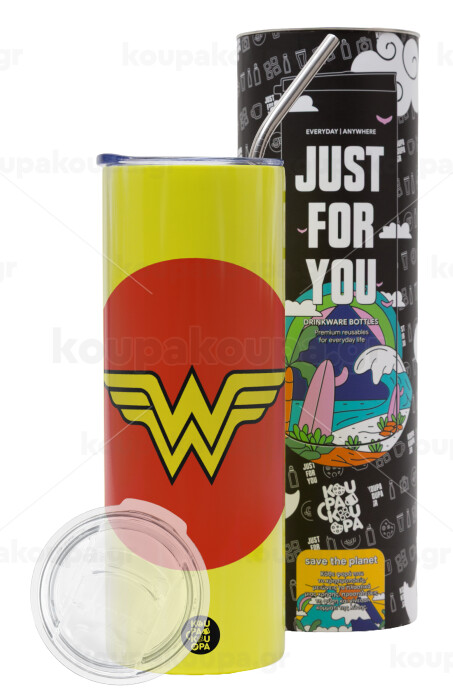 Wonder woman, Neon Yellow Travel Tumbler θερμό, μεταλλικό καλαμάκι(Ανωξείδωτο 304 Food grade, BPA free, 600ml)