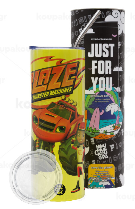 Ο Μπλέιζ και οι Φίλοι του, Neon Yellow Travel Tumbler θερμό, μεταλλικό καλαμάκι(Ανωξείδωτο 304 Food grade, BPA free, 600ml)