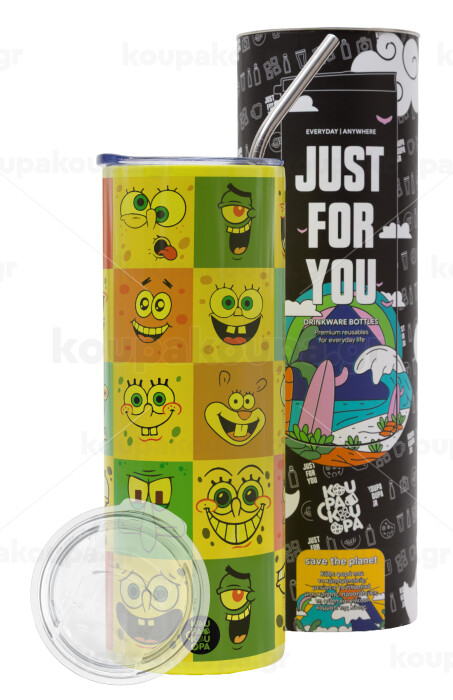Ο μπομπ και οι φίλοι του, Neon Yellow Travel Tumbler θερμό, μεταλλικό καλαμάκι(Ανωξείδωτο 304 Food grade, BPA free, 600ml)