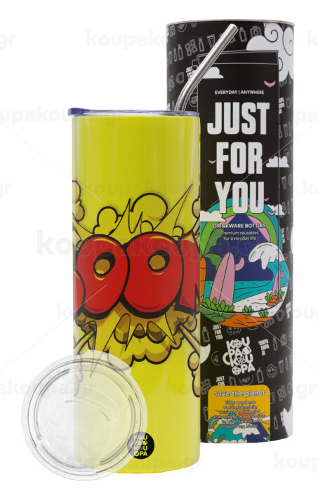 BOOM!!!, Neon Yellow Travel Tumbler θερμό, μεταλλικό καλαμάκι(Ανωξείδωτο 304 Food grade, BPA free, 600ml)