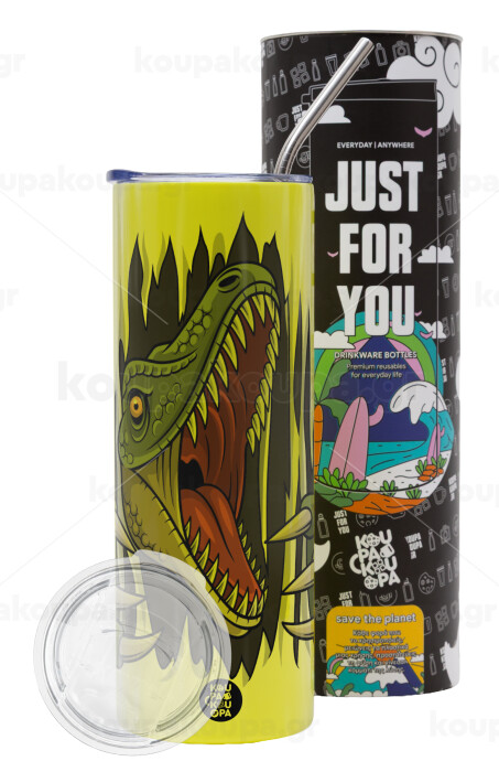 Dinosaur scratch, Neon Yellow Travel Tumbler θερμό, μεταλλικό καλαμάκι(Ανωξείδωτο 304 Food grade, BPA free, 600ml)