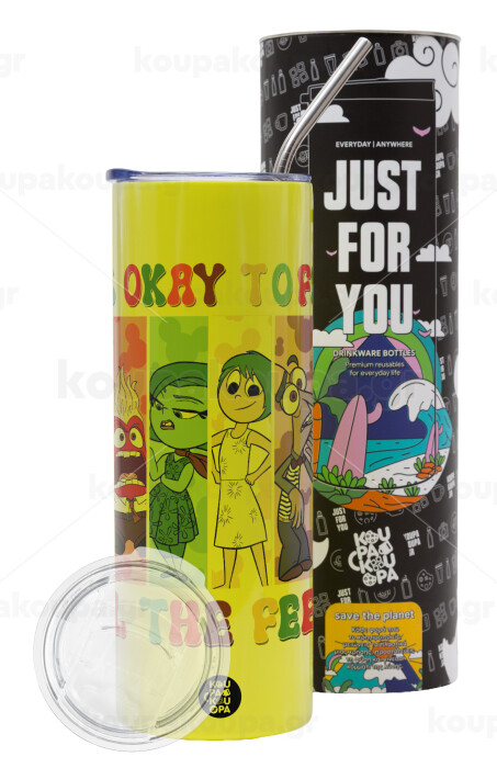 Inside Out It's Okay To Feel All The Feels , Neon Yellow Travel Tumbler θερμό, μεταλλικό καλαμάκι(Ανωξείδωτο 304 Food grade, BPA free, 600ml)