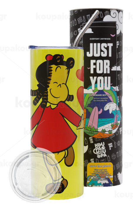 Η μικρή Λουλού, Neon Yellow Travel Tumbler θερμό, μεταλλικό καλαμάκι(Ανωξείδωτο 304 Food grade, BPA free, 600ml)