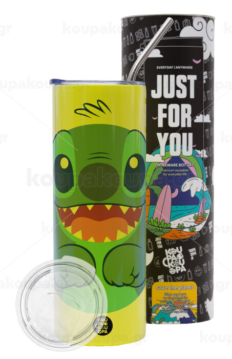 Lilo & Stitch blue, Neon Yellow Travel Tumbler θερμό, μεταλλικό καλαμάκι(Ανωξείδωτο 304 Food grade, BPA free, 600ml)