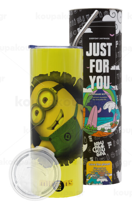 Minions hi, Neon Yellow Travel Tumbler θερμό, μεταλλικό καλαμάκι(Ανωξείδωτο 304 Food grade, BPA free, 600ml)