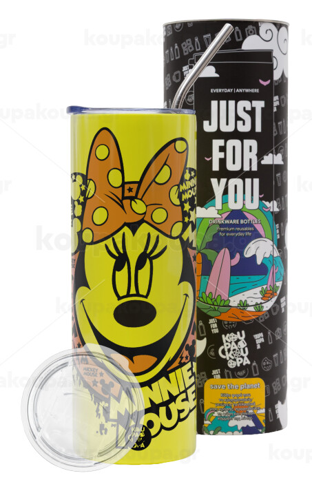Minnie mouse, Neon Yellow Travel Tumbler θερμό, μεταλλικό καλαμάκι(Ανωξείδωτο 304 Food grade, BPA free, 600ml)