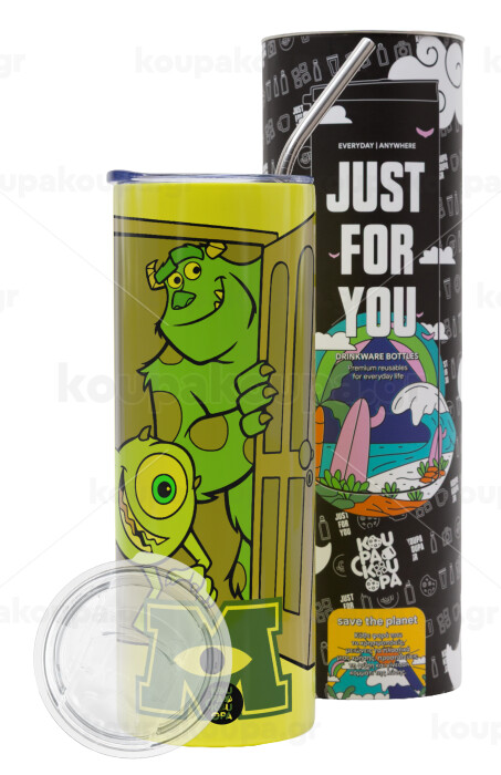 Monster inc, Neon Yellow Travel Tumbler θερμό, μεταλλικό καλαμάκι(Ανωξείδωτο 304 Food grade, BPA free, 600ml)