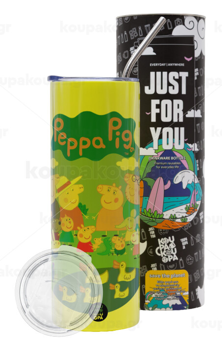 Peppa pig Family, Neon Yellow Travel Tumbler θερμό, μεταλλικό καλαμάκι(Ανωξείδωτο 304 Food grade, BPA free, 600ml)