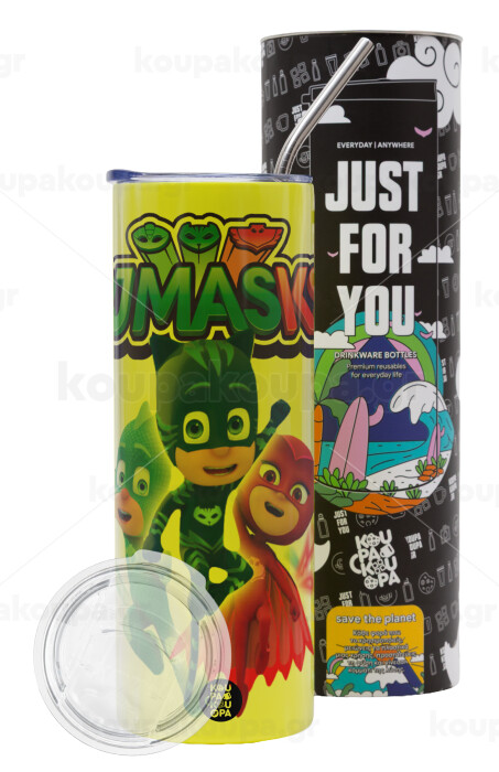 PJ masks, Neon Yellow Travel Tumbler θερμό, μεταλλικό καλαμάκι(Ανωξείδωτο 304 Food grade, BPA free, 600ml)