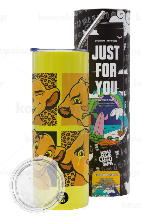 Simba, lion king, Neon Yellow Travel Tumbler θερμό, μεταλλικό καλαμάκι(Ανωξείδωτο 304 Food grade, BPA free, 600ml)