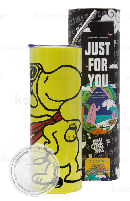 Snoopy ο πιλότος, Neon Yellow Travel Tumbler θερμό, μεταλλικό καλαμάκι(Ανωξείδωτο 304 Food grade, BPA free, 600ml)