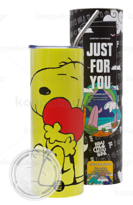 Snoopy, Neon Yellow Travel Tumbler θερμό, μεταλλικό καλαμάκι(Ανωξείδωτο 304 Food grade, BPA free, 600ml)