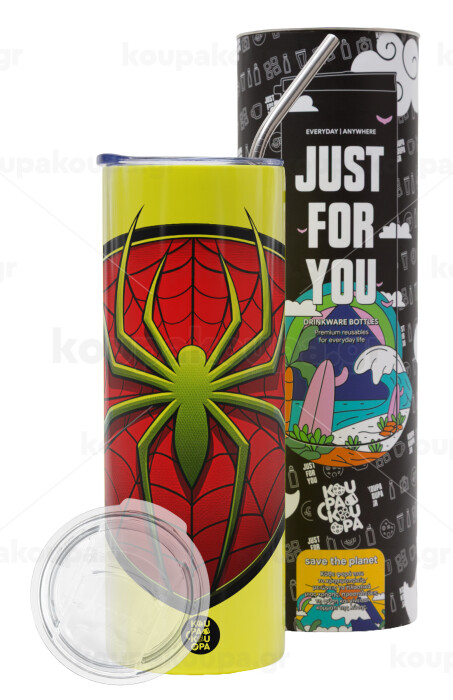 Spider-man, Neon Yellow Travel Tumbler θερμό, μεταλλικό καλαμάκι(Ανωξείδωτο 304 Food grade, BPA free, 600ml)