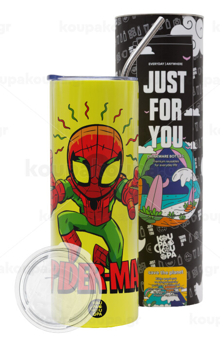 Spiderman flying, Neon Yellow Travel Tumbler θερμό, μεταλλικό καλαμάκι(Ανωξείδωτο 304 Food grade, BPA free, 600ml)
