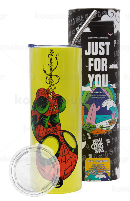 Spiderman upside down, Neon Yellow Travel Tumbler θερμό, μεταλλικό καλαμάκι(Ανωξείδωτο 304 Food grade, BPA free, 600ml)