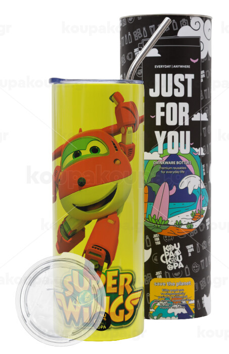 Super Wings, Neon Yellow Travel Tumbler θερμό, μεταλλικό καλαμάκι(Ανωξείδωτο 304 Food grade, BPA free, 600ml)