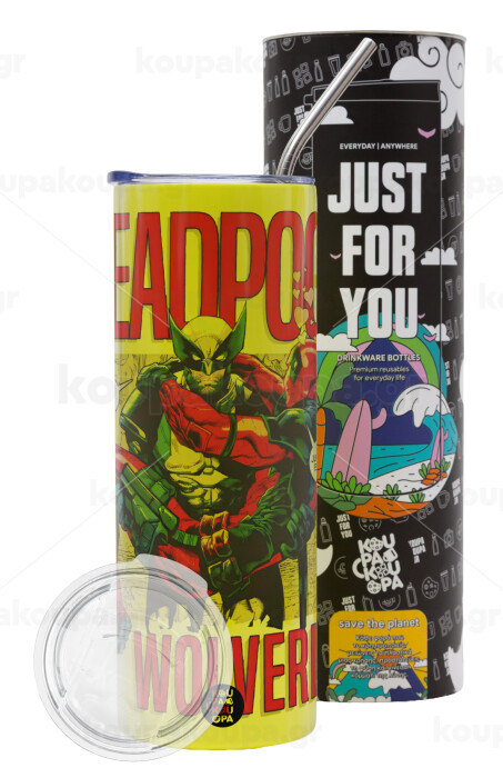 Superhero Deadpool Wolverine, Neon Yellow Travel Tumbler θερμό, μεταλλικό καλαμάκι(Ανωξείδωτο 304 Food grade, BPA free, 600ml)