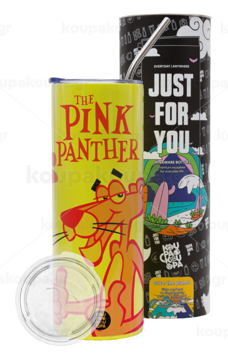 The pink panther, Neon Yellow Travel Tumbler θερμό, μεταλλικό καλαμάκι(Ανωξείδωτο 304 Food grade, BPA free, 600ml)