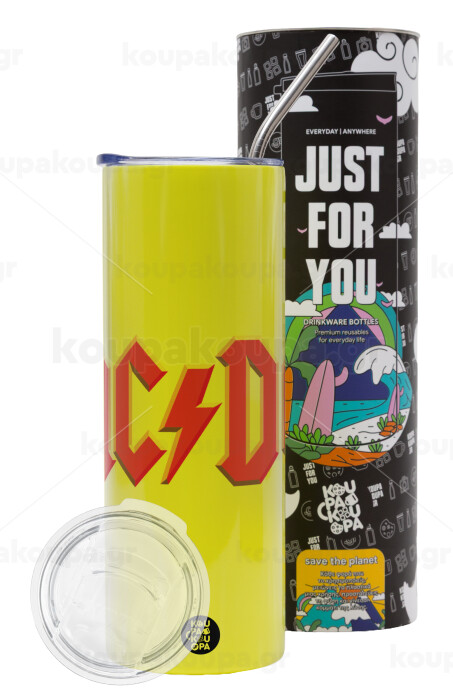 AC/DC, Neon Yellow Travel Tumbler θερμό, μεταλλικό καλαμάκι(Ανωξείδωτο 304 Food grade, BPA free, 600ml)