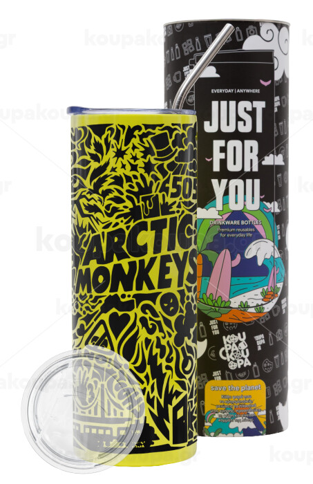 Arctic Monkeys, Neon Yellow Travel Tumbler θερμό, μεταλλικό καλαμάκι(Ανωξείδωτο 304 Food grade, BPA free, 600ml)