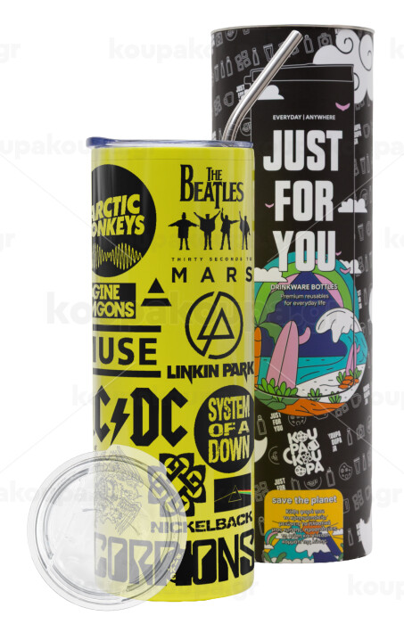 Best Rock Bands Collection, Neon Yellow Travel Tumbler θερμό, μεταλλικό καλαμάκι(Ανωξείδωτο 304 Food grade, BPA free, 600ml)