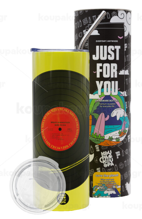 Columbia records bruce springsteen, Neon Yellow Travel Tumbler θερμό, μεταλλικό καλαμάκι(Ανωξείδωτο 304 Food grade, BPA free, 600ml)