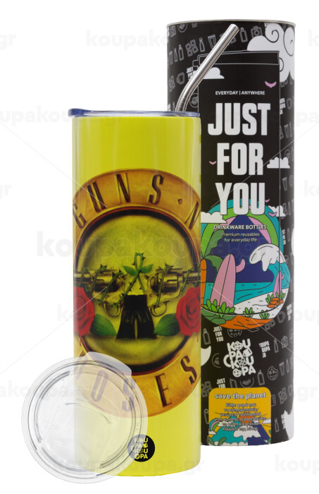 Guns N' Roses, Neon Yellow Travel Tumbler θερμό, μεταλλικό καλαμάκι(Ανωξείδωτο 304 Food grade, BPA free, 600ml)