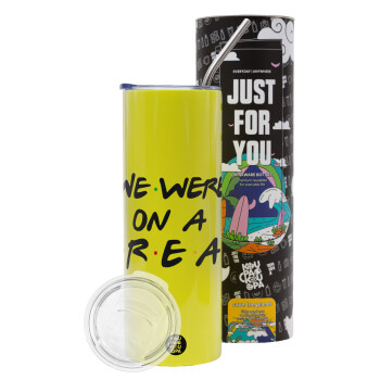 Friends we were on a break, Neon Yellow Travel Tumbler θερμό, μεταλλικό καλαμάκι(Ανωξείδωτο 304 Food grade, BPA free, 600ml)