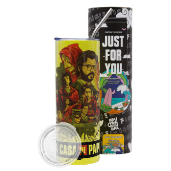 La casa de papel drawing cover, Neon Yellow Travel Tumbler θερμό, μεταλλικό καλαμάκι(Ανωξείδωτο 304 Food grade, BPA free, 600ml)